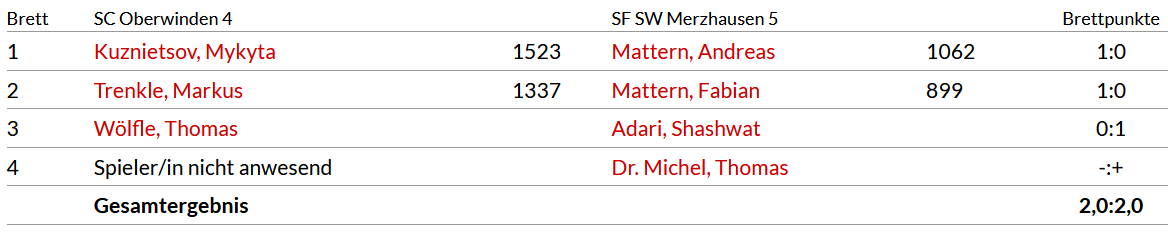Mit drei Mann angetreten, wurde ein 2:2 erzielt. Es gewannen M. Kuznietsov und M. Trenkle. Erfreulich war, dass Th. Wölfle zu seinem ersten Einsatz im Vereinsschach kam. Thomas hatte zu Schulzeiten schon Schach gespielt, danach aber viele Jahre nicht mehr. Er war durch das Dorffest-Event mit TBG in diesem Sommer inspiriert worden, sich wieder dem Schachspiel zu widmen. Im ersten Pflichtspieleinsatz reichte es noch nicht, etwas Zählbares zu holen. Es gilt, weiter dran zu bleiben, dann wird sich dies auch ändern.
