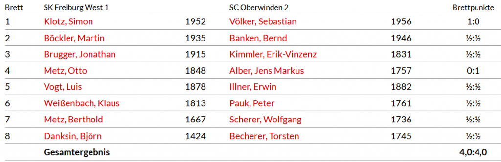 Zum Start in die neue Saison konnte die Erste einen knappen 4,5:3,5 Heimerfolg gegen Horben erzielen. Es wurde zäh gekämpft und bis nach 13:30 Uhr war noch keine Partie entschieden. Dann musste sich zunächst E. Kimmler mit den schwarzen Steinen geschlagen geben, bevor J. Alber ausglich. Jens hatte sich einen gefährlichen, weit vorgerückten Freibauern erspielt, der die Partie entschied. A. Wernet engte den gegnerischen König stark ein und münzte diesen Druck in einen Sieg um. Somit führte Oberwinden zwar mit 2:1 aber nach einem Mannschaftssieg sah es zu diesem Zeitpunkt noch lange nicht aus. Zu unklar war die Situation bei den noch laufenden Partien. Es folgten zwei Punkteteilungen an den beiden Spitzenbrettern. Auch B. Banken steuerte ein Remis bei. Dazu packte er für die Kiebitze auch den ein oder anderen überraschenden Zug aus. P. Meyer sah sich im Springer-Bauern-Endspiel mit Minusbauern unter Druck. Er schaffte es jedoch, mit einem Randfreibauern den gegnerischen Springer zu binden und die beiden Freibauern des Gegners wurden durch König und Springer gestoppt – Remis. Beim Stand von 4:3 blieb es dann Neuzugang M. Germer vorbehalten, den Mannschaftssieg unter Dach und Fach zu bringen. Marcel folgte zu dieser Saison seinem Bruder Philipp, der schon viele Jahre für Oberwinden am Brett ist. Marcel zeigte eine gute Leistung, lies im Doppelturmendspiel nichts anbrennen und sicherte mit Remis das knappe 4;5:3,5.