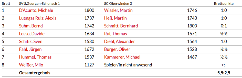 Für die Dritte war es ein Tag zum Vergessen. Auswärts beim SV St. Georgen-Schonach musste zunächst ein kurzfristiger, krankheitsbedingter Ausfall verkraftet werden und man war nur zu siebt am Start. B. Schmitt glich das jedoch im Blitztempo zum 1:1 aus und machte sich auch zügig wieder auf den Heimweg. Präsi Kammerer und T. Ruf steuerten jeweils ein Remis bei. Eine Niederlage aufgrund von Handyklingeln sowie zwei weitere Niederlagen an den Spitzenbrettern von. M. Wißler und M. Heß besiegelten dann allerdings die Niederlage. Zuletzt kämpfte O. Burger in der mit Abstand längsten Partie noch erfolgreich und errang ein Remis zum Endstand von 2,5:5,5.