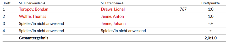 4. Mannschaft: Die Vierte hatte als einziges Oberwindener Team ein Heimspiel. Da die Gäste aus Breisach nur zu zweit antraten, zeichnete sich schon früh ein Mannschafterfolg ab. M. Kuznietsov und M. Riesterer stellen mit Siegen den 4:0 Erfolg sicher.