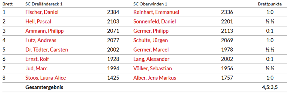 Die Erste musste in Dreiländereck mit 3,5:4,5 die zweite Saisonniederlage einstecken. Bei D. Sonnenfeld gab es ein eher unspektakuläres Remis. Danach entwickelte sich aber ein Mannschaftskampf mit überraschenden Wendungen. M. Reinhart hatte Materialvorteil, dann jedoch brachte ein Turm-Einsteller den Verlust. Nach einem weiteren Remis durch M. Germer hatte leider der Gegner von J. Schulte in einer interessanten Partie das bessere Ende für sich. Eine dreimalige Stellungswiederholung sorgte bei S. Völker für remis bevor P. Germer in beiderseitiger Zeitnot zum Frust seines Gegners durch Zeitüberschreitung gewann. Bei A. Lang bewahrheitete sich der Spruch: „der zweitletzte Fehler gewinnt“ – nach einigem hin- und her sorgte ein Turmverlust des Gegners für den Punkt für Alex. Beim Stand von 3,5;3,5 richtete sich die ganze Aufmerksamkeit auf die Partie von J. Alber. Allerdings hatte Jens gegen die aufstrebende Nachwuchsspielerin der Heimmannschaft schon länger mit einem Minusbauern zu kämpfen, konnte das nie mehr wirklich ausgleichen und verlor.