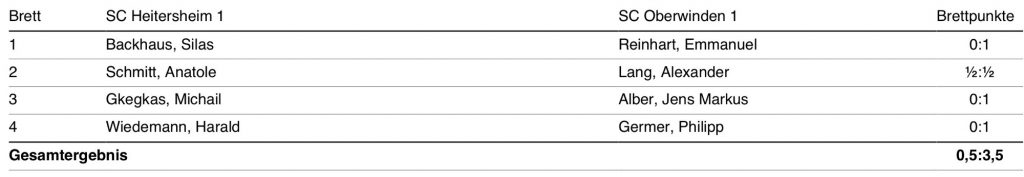 Am 4. Spieltag traf die Erste Mannschaft des Schachclub Oberwinden auf Emmendingen. Als Tabellenführer wollte man die Punkte in Oberwinden behalten. Auf dem Papier schien das machbar, doch am Brett stemmten sich die Emmendinger dagegen. Siege von Peter Meyer und Bernd Banken, und Remis durch Phillip und Marcel Germer sowie Andreas Wernet und Jens Alber standen Niederlagen von Sebastian Völker und Alex Lang entgegen. So trennte man sich 4:4.