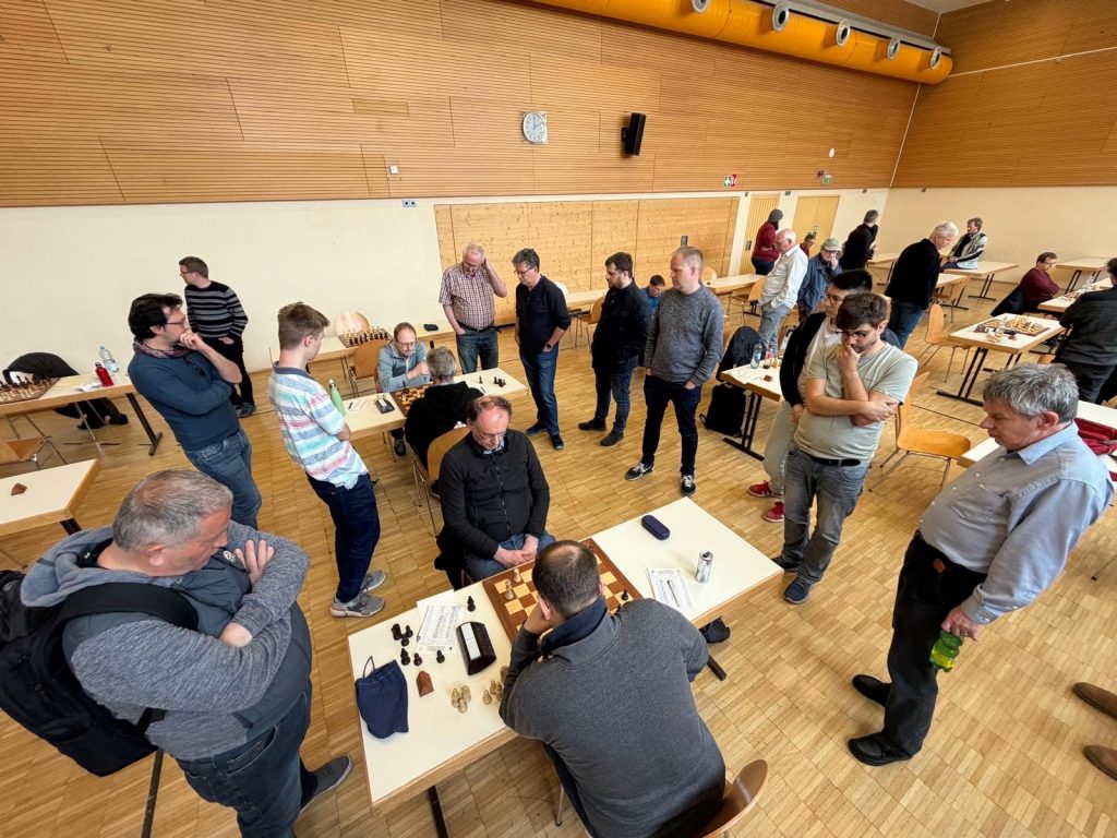 Nach dem Auftaktsieg gegen die Jugend aus Bebenhausen bekam es die erste Mannschaft mit Emmendingen zu tun. Philipp und Alex holten die Punkte zum 2:2. Gegen Horben konnte Jens in einem schön vorgetragenen Sizilianer gewinnen. Philipp rettete sich gegen seinen deutlich stärkeren Gegner noch in ein Dauerschach, aber leider ging das Spiel trotzdem mit 1,5:2,5 verloren. Dafür gab es in Runde vier gegen Freiburg Wiehre zum ersten Mal die Maximalpunktzahl. Im letzten Spiel vor der Mittagspause trennte man sich noch 2:2 von Brombach 2.