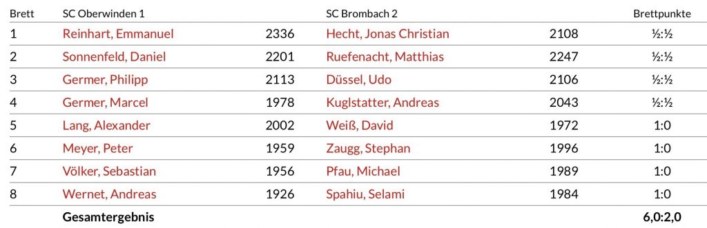 Die Zweite gewann mit starker Aufstellung gegen Hornberg mit 6:2. An den Brettern 1-4 hatte die Zweite Spieler am Brett, die jeweils auch mehrfach in dieser Saison bereits in der Ersten zum Einsatz kamen. Dies spiegelte sich in vier Punkten an den ersten vier Brettern wider. Im Gegenzug halfen die beiden Martins – Wißler und Heß in der Dritten, gegen Denzlingen ein 4:4 zu holen.