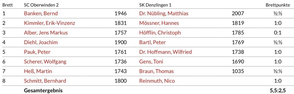 Bernd Banken hatte im Turmendspiel einen Bauern weniger, was er aber verteidigen konnte und Remis spielte. Nachdem das Match für Oberwinden bereits gewonnen war, gab der Gegner von Alex Lang auch die letzte Partie Remis, in der Alex deutlich schlechter stand.