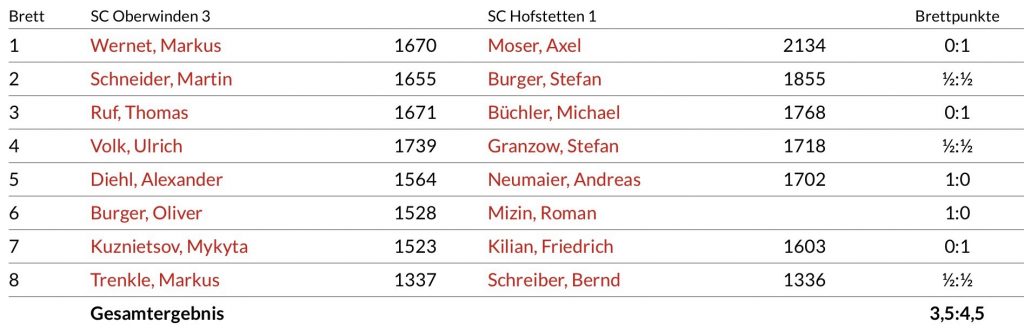 3. Mannschaft unterliegt Hofstetten 1 knapp mit 3,5:4,5