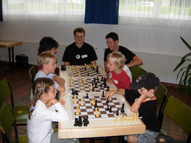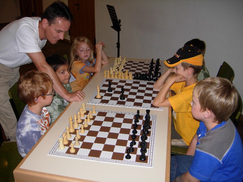 Auch dieses Jahr war es für den Schachclub selbstverständlich für die Kinder in den Schulferien wieder einen Schachkurs anzubieten. Die vier Trainer Martin Schneider,Thomas Ruf, Joachim Diehl und Wolfgang Scherer zeigten den Jugendlichen zuerst, wie die Figuren ziehen und was für Sonderzugmöglichkeiten manche Figuren bzw. die Bauern haben. Da ist zum einen die Rochade, das Schrägschlagen des Bauern sowie das En Passant schlagen. Wie man eine Partie eröffnet, seine Figuren entwickelt und eine Einführung in taktische Finessen wie Spieß, Gabel, Abzug- oder Doppelschach beendete den ersten Teil des „Trainings“. Nach einer Stärkung für die Kinder mit Fanta und Brezeln startete der zweite Teil in dem die Kinder das soeben erlernte in einem kindgerechten Computerspiel anwenden konnten. Das Schach-Lern-Programm „Fritz & Fertig, das schon mehrfach ausgezeichnet wurde für äußerst gelungene und didaktisch wertvolle Kinder-Software, ist ein hervorragendes Übungsprogramm. Die Kinder hatten viel Spaß daran ihr Schach-Wissen spielerisch anzuwenden. So mussten die Kinder als Sumoringer den anderen aus dem Ring werfen, auf dem schnellsten Weg auf einem Schachbrett Blumen pflücken oder auf dem kürzesten Weg mit einem Pferd einen Sprungparcours bewältigen. Beim Kloschüsselnzerdeppern war deutlich zu hören, wie erfolgreich die Kinder waren. Auch beim Goldmünzen einsammeln vernahm man dem juchzen der Kinder, dass sie fast von Spinnen eingefangen wurden.