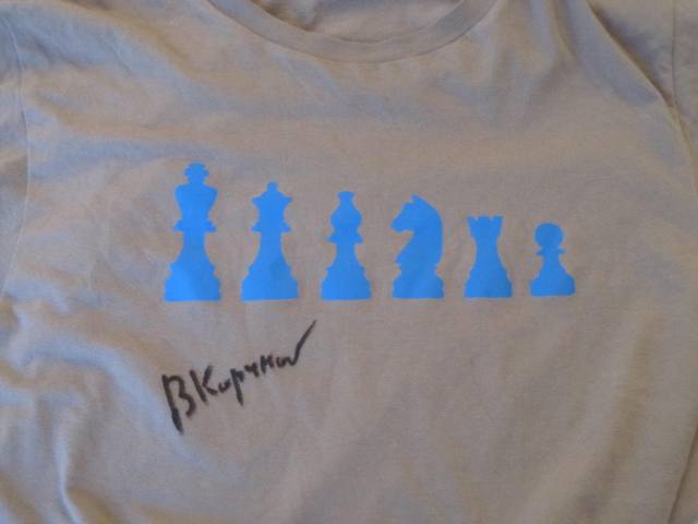 „Nachdem ich in der ersten Partie richtig geschlachtet wurde“, so Uhlmanns Kommentar, gelang es ihm in der zweiten Auflage, nun mit den weissen Figuren, sich vor rund 50 Zuschauern aus deutlichem Positions-, auch einen Materialvorteil gegen den als launisch geltenden Kortschnoi zu verschaffen. Dieser verpuffte jedoch mehr und mehr aufgrund „Kortschnois fürstlicher Verteidigung“, wie Uhlmann später bescheinigte, der nun auch mit zunehmender Zeitnot zu kämpfen hatte (Bedenkzeit analog des ersten Fights: eine Stunde pro Spieler und Partie). Letztlich war Uhlmanns Hypothek am historischen Schachtisch, an welchem schon 1960 bei der Schacholympiade in Leipzig gespielt wurde, zu gross und zwang ihn erneut zur Aufgabe. Endstand 2:0 für den zweifachen Vizewelt- und Grossmeister Viktor Kortschnoi, von welchem ich heute, kurz vor Partiebeginn, mein T-Shirt signieren lassen konnte.