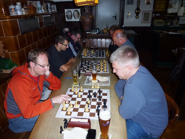 Leider konnten sich Martin „Wiesel“ Wissler aufgrund des anstehenden sehr anstrengenden Bouletages in Waldkirch und Michael „Präsi“ Kammerer aufgrund des vorhergehenden sehr anstrengenden Bewirtungsabends im Schützenhaus nicht zu einer Teilnahme durchringen. Erwähnenswert ist noch die Beherzigung des Tipps des Hauptmannschaftsführers Peter Meyer, welcher beim letzten Blitzturnier einen bewußten Umgang mit dem „Vorwärtsrücken“ zwischen den Runden sowie der Wahl des „Drehbrettes“ forderte. Um dem gerecht zu werden war das „Drehbrett“ erstmalig auf der nach Elzach gerichteten Seite des Stammtisches direkt vor der Theke (positive Auswirkung auf den Durchlauf auf der Bankseite des Stammtisches) und das „Vorwärtsrücken“ wurde vor Start der ersten Runde explizit einmal geübt (was dem Schreiber dieser Zeilen gleich den gefühlten Nachteil der weißen Steinen gegen den Caro-Kann-Spezialisten der Runde bescherte).