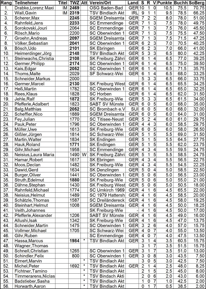 Zweiter wurde der für den oberfränkischen Zweitligisten TSV Bindlach startende IM Gavin Wall mit 9,5 Punkten. Er war der einzige, dem es gelang, Sieger Drabke ein Remis abzutrotzen. Der Londoner musste jedoch auch eine überraschende Niederlage gegen den jungen Emmendinger Jens Rahnfeld hinnehmen, der sich gegen Gavin´s Philidor-Verteidigung bestens präpariert zeigte und verdient gewann.
