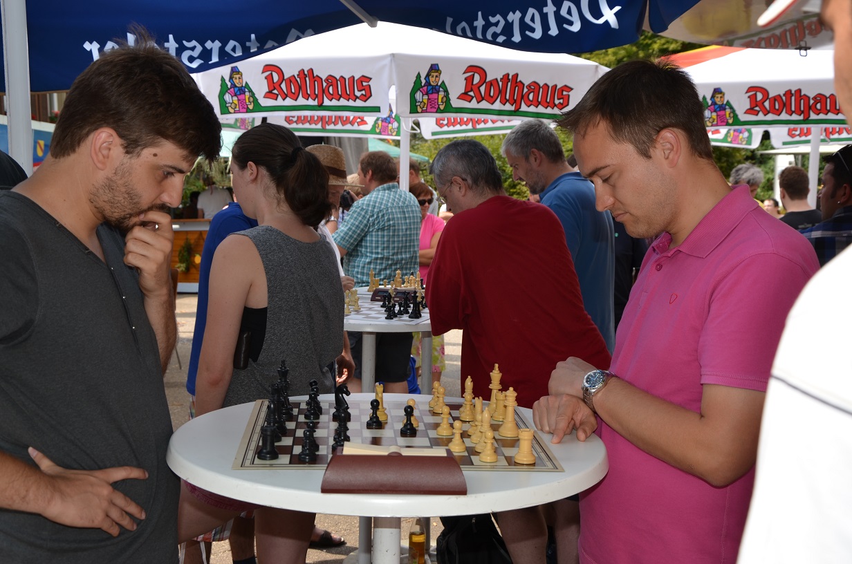 Es macht den besonderen Reiz dieses Turniers aus, dass eben nicht alles so ist, wie man als Schachspieler dies normalerweise kennt. Denn neben den 32 Figuren und 5 Minuten Bedenkzeit, mit denen jeder Spieler pro Partie an den Start geht, sind ein Blasmusikkonzert auf der Bühne nebenan und – an den vorderen 10 Brettern – die Bistrotische, an denen man seine Partie im Stehen bestreitet, doch eher ungewöhnlich. Während der eine ob dieser Störmomente den Verlust seiner Konzentrationsfähigkeit beklagte, schien manch anderen diese besondere Atmosphäre geradezu zu beflügeln. Doch auch jene, die unter ihren schachlichen Erwartungen blieben, werden bestimmt wieder kommen, und sei es nur, weil man bei uns seinen Frust so trefflich direkt neben dem Brett ertränken kann.
