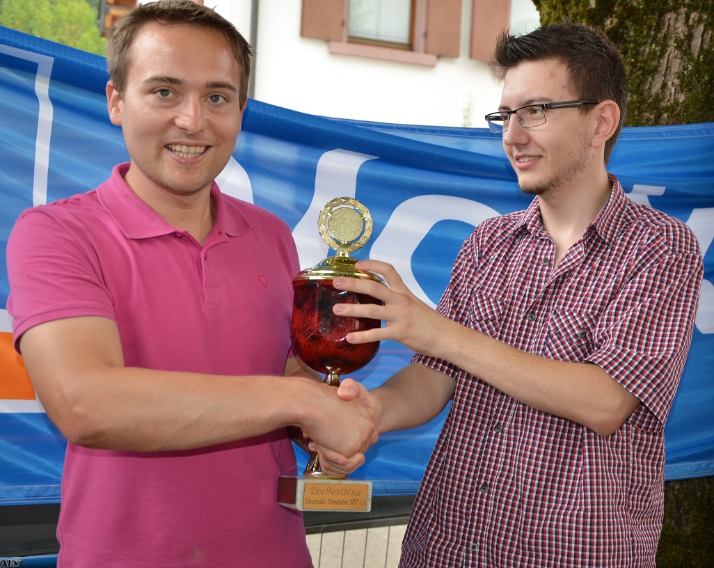 Jens Rahnfeld, der auch den Preis für den besten Jugendlichen gewann, wurde mit 7,5 Punkten Vierter, da sich das Dreisamtäler „Urgestein“ Max Scherer mit starken 8 Punkten noch vor ihn aufs Treppchen schob. Ein bemerkenswertes Turnier spielte auch der Fünftplatzierte Jouri Sorokovski vom SC Emmendingen, der ebenso auf 7,5 Punkte kam wie der beste Akteur vom SC Oberwinden, Mario Rösch, auf Rang 6. Für Mario, der zugleich zusammen mit Alex Lang die Turnierleitung inne hatte, war es anschließend die größte Herausforderung bei der Siegerehrung gegen die Geräuschkulisse der Alphörner anzukämpfen, die zwischenzeitlich den Platz der Blasmusik eingenommen hatten.