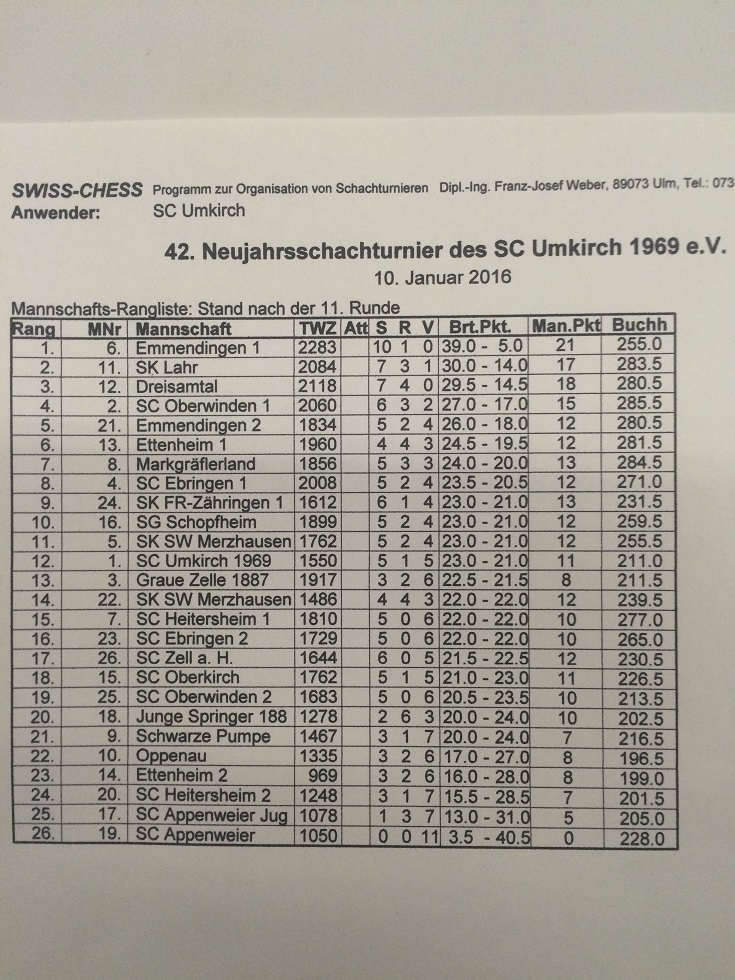 Mit zwei Mannschaften nahm der SCO am traditonellen Neujahrsschachturnier in Umkirch teil, das bereits in der 42. Auflage durchgeführt wurde.