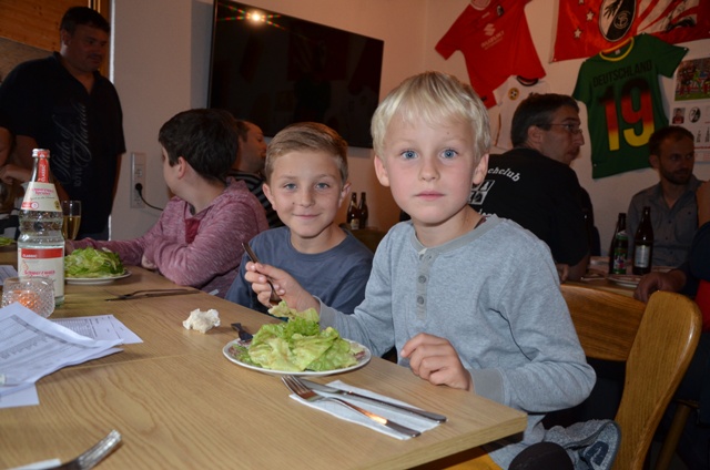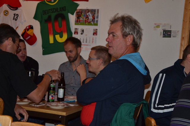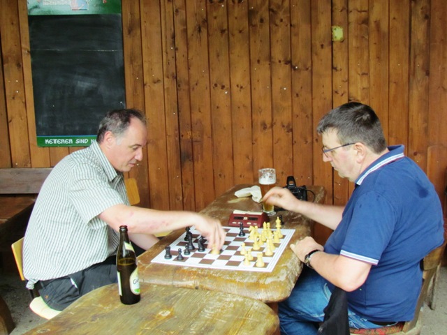 Gerade dieser rege Austausch zeigt aber auch, wie man sich freute, wiedermal im Kreise der Schachspieler zusammen zu kommen. So wurden nach dem Essen gleich Bretter zum Blitzen aufgebaut, es bildeten sich Grüppchen mit kühlem Bier und intensiven schachsportlichen Gesprächen oder es wurden einfach nur Neuigkeiten und Anekdoten ausgetauscht. Gegen Ende wurde es dann draußen etwas kühler und die Verbliebenen fanden sich in der warmen Stube zum Finale des olympisch Fußballturniers zusammen.