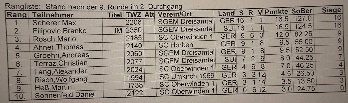Am Nachmittag gab es dann noch das Einzelblitz. Alle 4 Oberwindener starteten im Meisterturnier. Bei Daniel und Alex war die Luft komplett raus. Martin hatte ein paar vielversprechende Stellungen, musste dann aber eher ungewöhnlich der Bedenkzeit Tribut zollen. Lediglich Mario konnte normales Nivea zeigen und erreichte den dritten Platz. Die Spitzenplätze gingen an die Dreisamtäler Branko Filipovic und Max Scherer. Im Stichkampf konnte der IM sich gegen Max durchsetzen und wurde Bezirksblitzmeister.