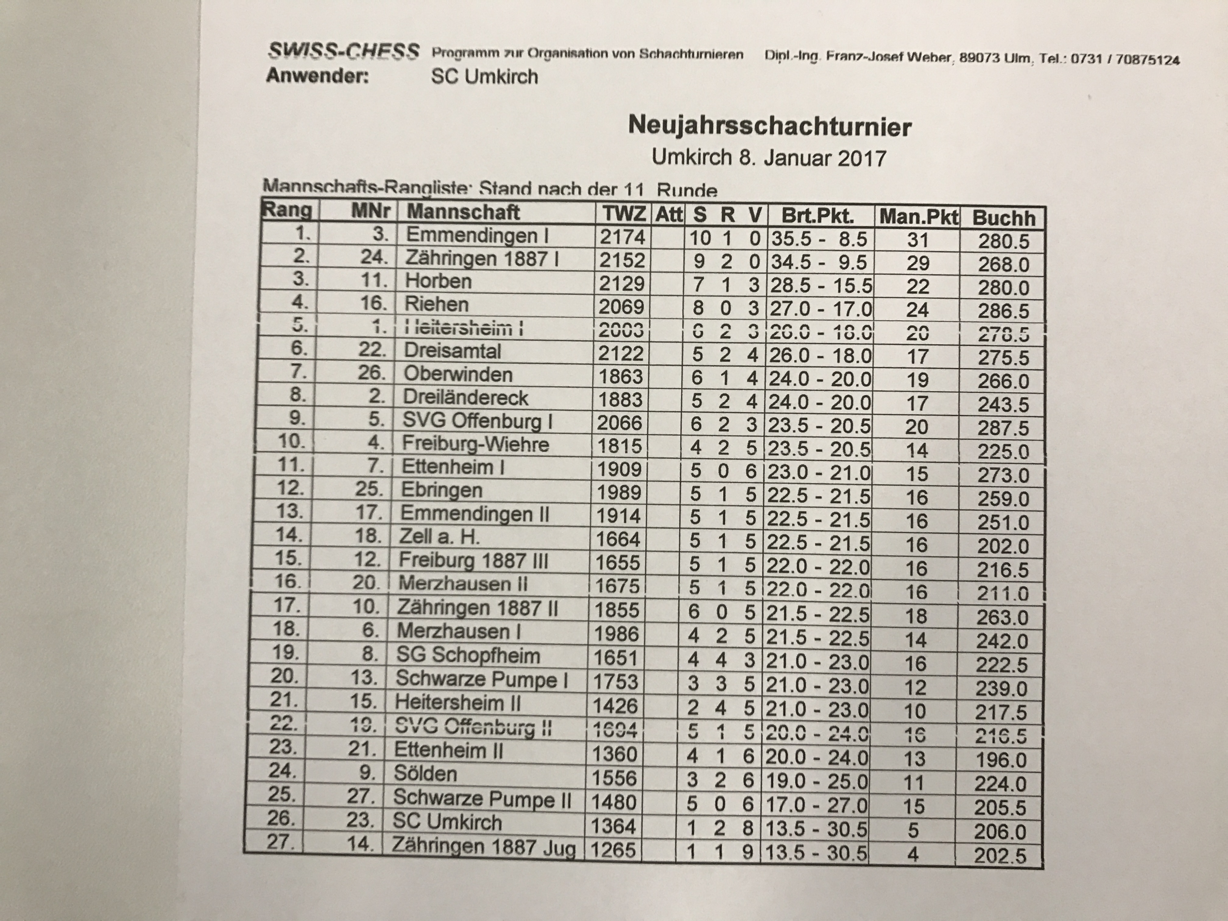 Sieger wurde der Favorit Emmendingen hauchdünn mit einem Brettpunkt Vorsprung vor Zähringen. Schön, dass Horben eine starke Mannschaft stellte, die sogleich den dritten Platz belegte.