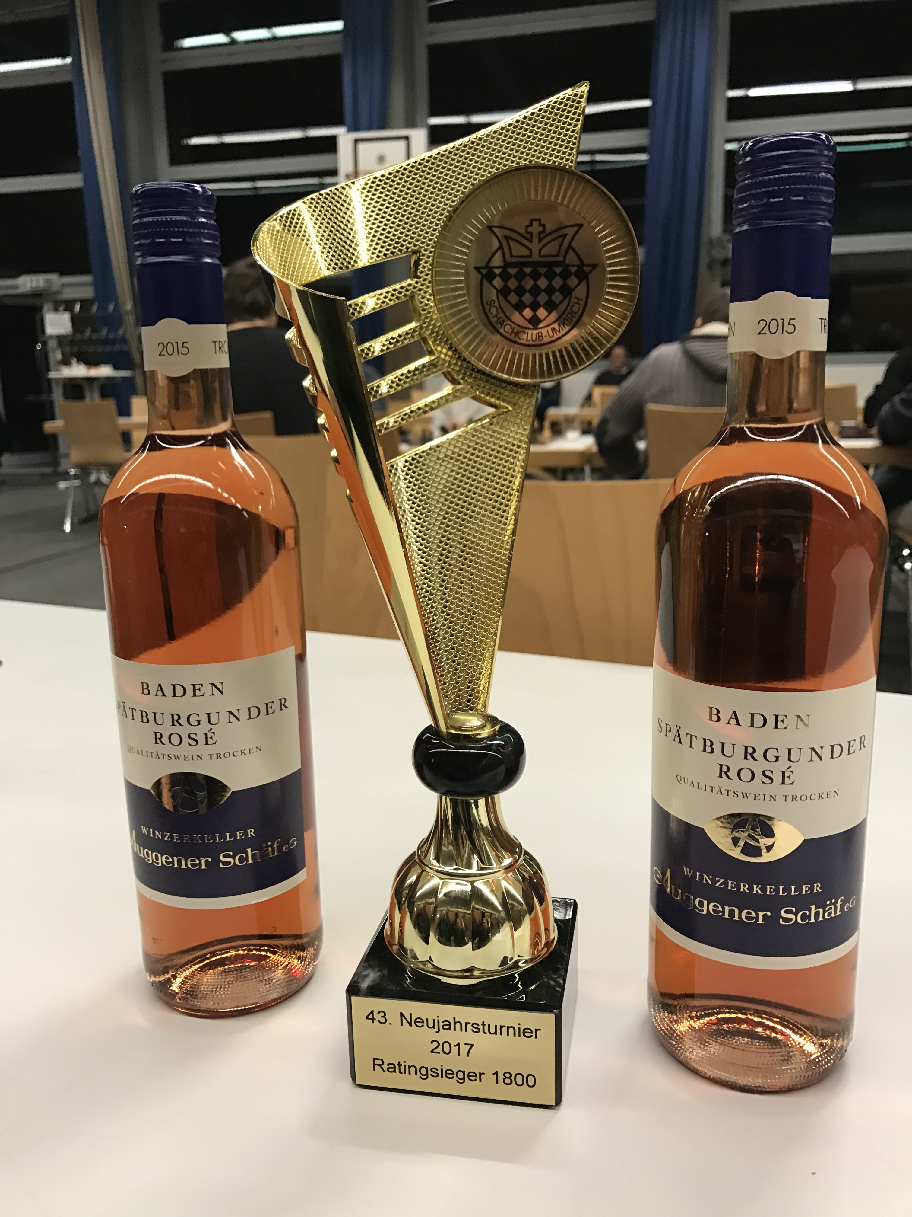 img_3618_aKurzfristig hat sich noch ein Oberwindener 4er-Team für das traditionelle Schnellschachturnier gefunden. Mit Mario, Blitz-Monster Martin, Franz-Paul als „Leihgabe“ von Simonswald und Alex war ein Team mit DWZ-Schnitt 1863 am Start. Damit waren wir an Nummer 13 gesetzt. Wir haben uns nicht viel ausgerechnet, umso besser lief es dann. Mit sechs Siegen und einem Unentschieden belegten wir in dem 11-rundigen Turnier den Siebten Platz. Zu unserer Überraschung konnten wir damit den Ratingpreis bis 2000 DWZ gewinnen Pokal und Wein siehe Bild.