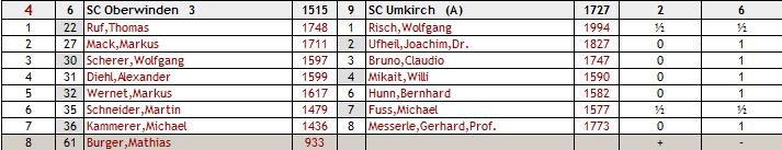 Beide Mannschaften konnten trotz des Abstiegsduells nicht in Bestbesetzung antreten. Letztendlich entscheiden war der Kampfeswille. So konnten Uli Volk und Bernhard Schmidt jeweils einen Mehrbauern zum Sieg verwerten und Michael Weber trotz der langen Anreise wieder eine konzentrierte Leistung auf’s Brett bringen und ebenfalls voll Punkten.