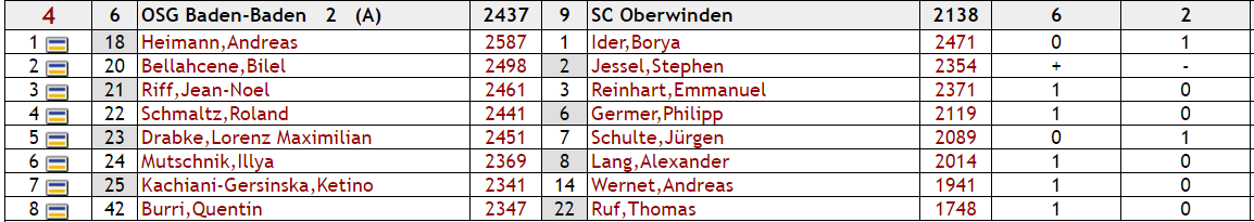 Gegen Oberwinden traten sie übermächtig mit 3 Großmeister, 4 Internationale Meister und einem FIDE Meister an. Insgesamt war der Wertungsschnitt der Baden-Badener um 300 Punkte höher als der der Oberwindener. Das sind Welten. Oberwinden, das kurzfristig noch krankheits bedingt einen Ausfall zu beklagen hatte, konnte leider nur mit 7 Mann antreten.