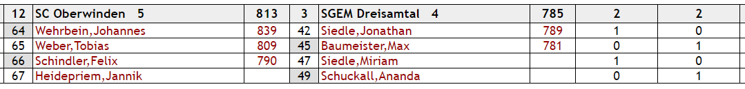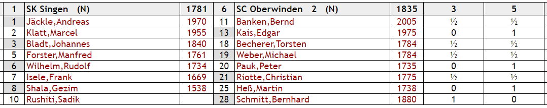 Am 6. Spieltag konnte die Zweite des SCO in Singen einen wichtigen Sieg feiern. Mit 5:3 sicherte man sich 2 Punkte für den Klassenerhalt in der Landesliga. Siegreich waren Edi Kais, Peter Pauk und Martin Hess. Bernd Banken, Torsten Becherer, Michael Weber und Christian Riotte spielten Remis. Mit diesem Sieg konnte man sich ein wenig Luft verschaffen im Abstiegskampf. Um den Klassenerhalt zu schaffen wäre ein weiterer Sieg hilfreich. Am nächsten Spieltag ist der Zweitplatzierte aus Pfullendorf zu Gast. Vielleicht gelingt ja eine Überraschung.