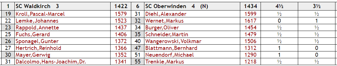 Obwohl die Dritte Mannschaft des SCO an diesem Spieltag der Bezirksklasse spielfrei war,konnte die Vierte nicht in Bestbesetzung antreten. Gegen Waldkirch 3 war ein Sieg zum Greifen nahe, leider wurde es eine knappe 3,5:4,5 Niederlage. Markus Wernet konnte als einziger gewinnen, Alex Diehl, Oliver Burger, Martin Schneider, Volkmar Wangerowski und Markus Trenkle spielten Remis. Damit belegt man in der B-Klasse den vorletzten Tabellenplatz und ist in höchster Abstiegsnot. Am nächsten Spieltag muss gegen den Tabellenletzten Heitersheim 3 gewonnen werden, will man noch eine Chance auf die Klassenzugehörigkeit haben.