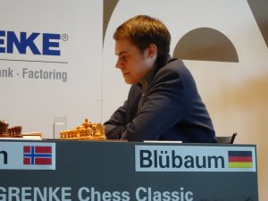 Am Samstag waren Andi und Alex in Karlsruhe um den Weltmeister und die weiteren Topspieler zu sehen, aber auch um die Vereinskollegen anzufeuern. Die Chess Classic, also das Großmeisterturnier, war sehr spannend, da die nominell schwächeren sich aufbäumten und punkten konnten. Als erstes war die stärkste Frau Hou Yifan mit dem Weltranglistendritten Caruana fertig und konnte diesen bezwingen. Auch wenn sie nicht die von uns besten Züge gesehen hat. 😉 Auch Arkadij Naiditsch stand dem nicht nach und konnte den Angriff von Vachier-Lagrave kontern und einen ganzen Punkt einsammeln. Georg Meier spielte gegen Levon Aronian eine solide Partie. Als es schien, dass er mit den schwarzen Steinen Vorteil hatte und evtl. es mehr als nur ein Remis geben könnte, packte Levon Aronian seine ganze Routine aus und manövrierte die Partie in den Remishafen. Ganz begeistert waren wir von der Partie, die unser Jungnationalspieler Mathias Blühbaum mit seinen 19 Jahren gegen den Weltmeister Magnus Carlsen spielte. Nicht nur, dass er trotz höchster Zeitnot die erste Zeitkontrolle erreichen konnte, sondern auch dass er danach noch alle Gewinnversuche von Magnus Carlsen verteidigen und den halben Punkt festhalten konnte. Eine Klasse Leistung, die hoffen lässt, dass Blühbaum in Richtung ELO 2700 marschieren könnte.