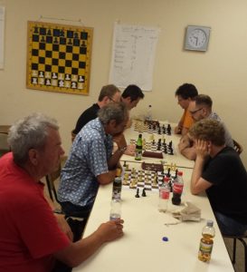 Durch die Schließung des Adlers war ein Umzug des Schachclubs in eine neue Lokalität nötig geworden. Inzwischen ist die Eingewöhnungsphase abgeschlossen und es ist nicht nur regelmäßig für Getränkenachschub zum Selbstkostenpreis gesorgt, sondern auch der neuen Spielort, der Jugendraum des Schachclubs in der Friedhofstraße in Niederwinden, ist bekannt. So durften trotz der heißen Temperaturen und des Sommerlochs die letzten Male viele eigene Mitglieder begrüßt werden und auch Gäste waren anwesend. So schaute auf Heimatbesuch der libanesische Schachfreund FM Faisal Khairallah, um nicht nur mit Eddi die Klingen zu kreuzen, vorbei und auch Jens Alber von Freiburg West hat den Trainingsabend des SCO für sich entdeckt.