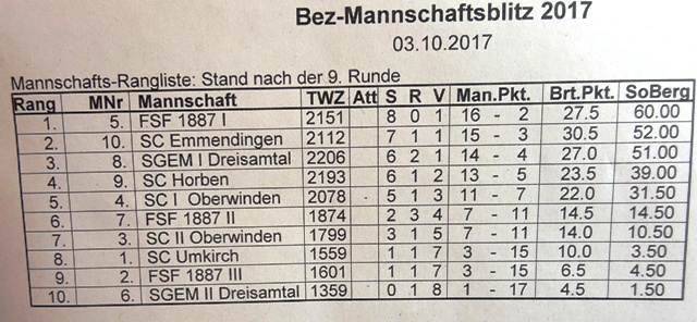 Beim Mannschaftsblitz starteten 10 Teams worüber sich Bezirksturnierleiter für Blitz und Pokal Max Scherer sehr freute. FSF 1887 stellte mit 3 Mannschaften das größte Kontingent. Aus Oberwinden gingen 2 Mannschaften an den Start. Die Favoriten für den Turniersieg waren nach den Wertungszahlen zuvorderst die Mannschaft des Ausrichters, also Dreisamtal, gefolgt von Horben und FSF 1887. Überraschend, dass der Titelverteidiger aus Emmendingen in der Startrangliste nur den 4. Platz belegte. Spannend blieb es bis zum Schluss. Die letzte Runde brachte die bis dahin führenden Teams von Emmendingen und FSF 1887 gegeneinander. Die Freiburger blieben dabei siegreich und konnten an den von Anfang an führenden Emmendingener vorbeiziehen. Bezirksmannschaftsblitzmeister 2017 FSF 1887, herzlichen Glückwunsch.