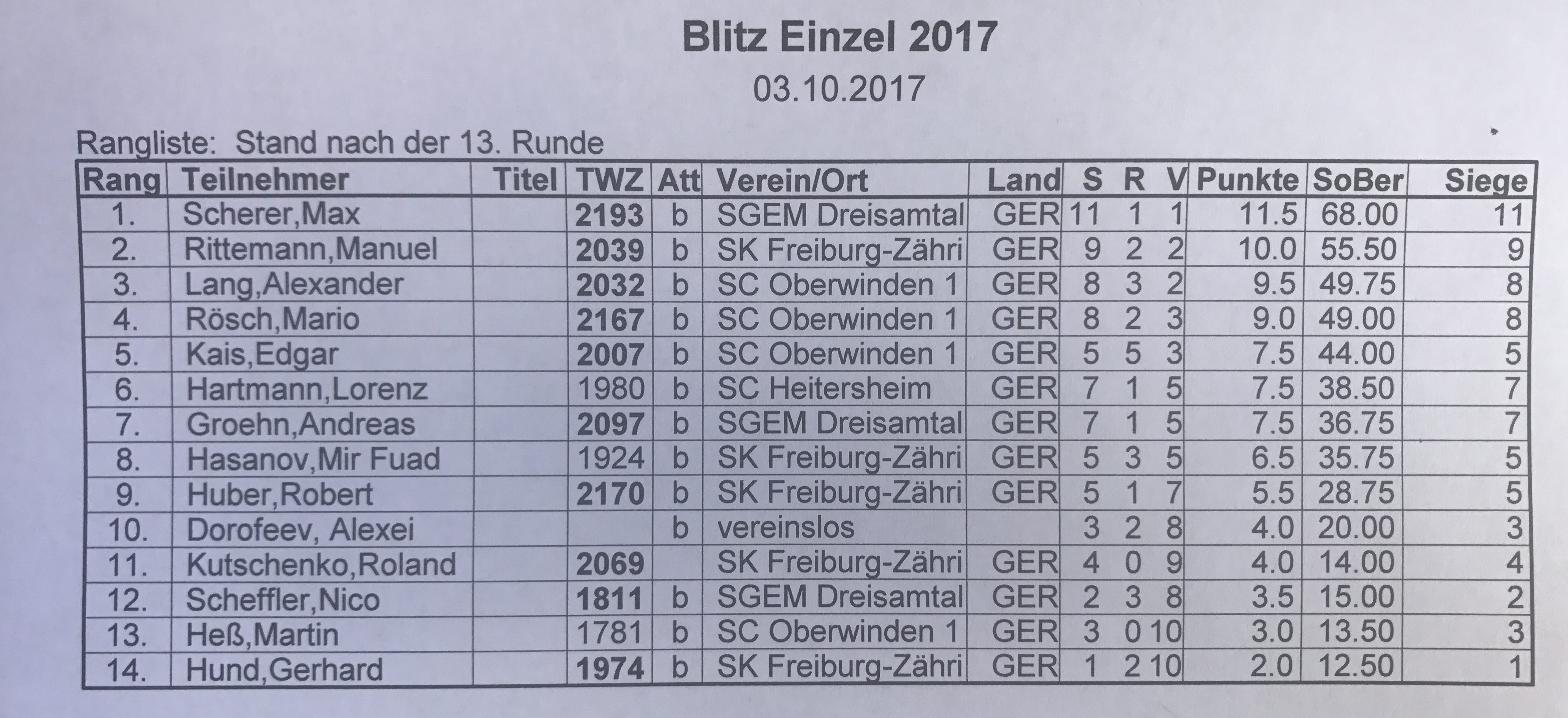 Nicht alle, die Vormittags noch in den Mannschaften geblitzt haben, traten auch zum Einzel an. Es kamen mit 14 Spielern in der A und 15 Spielern in der B-Gruppe doch eine ordentliche Teilnehmerzahl zusammen. Die A-Gruppe sah ein sehr enges Teilnehmerfeld mit vielen Teilnehmern über 2000 ELO/DWZ, wo fast jeder jeden schlagen konnte. Am Ende setzte sich hier Lokalmatador, Turnierleiter, Schiedsrichter und Setzranglistenerster und neuer Bezirksblitzmeister Max Scherer mit 13 Punkten erfolgreich durch. Herzlichen Glückwunsch. Die Oberwindener Teilnehmer in der A-Gruppe boten eine gute Gesamtleistung: 3. Alex Lang 9,5 P, 4. Mario Rösch 9 P, 5. Eddie Kais 7,5 P, 13. Martin Hess 3 P.