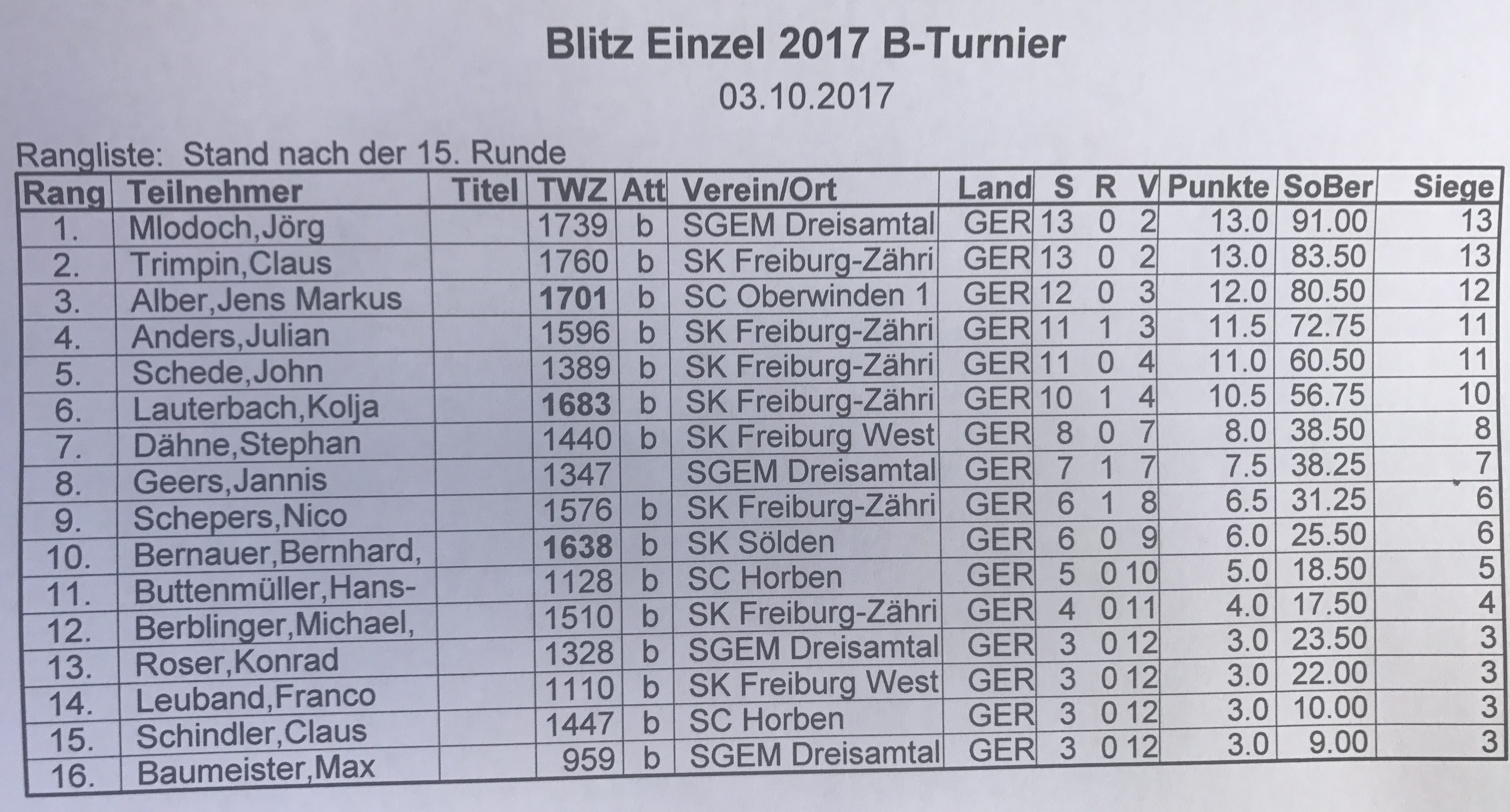 Die B-Gruppe wurde von Jörg Mlodoch, ebenfalls Dreisamtal gewonnen. Hier hatte Jens Alber einen grandiosen Start mit 8 aus 8. Ein kleiner Hänger lies ihn zurückfallen, er konnte sich aber im Schlussspurt mit 12 Punkten den 3. Platz sichern.