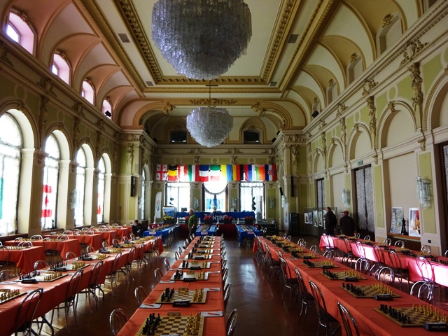 Doch nun zum eigentlichen Zweck unserer Reise, dem Schach. Das Turnier ist in A- und B-Open eingeteilt, wobei das A-Open mit einer Teilnehmerzahl von 119 beginnend mit IM Nikita Petrov (Elo 2564) gefolgt von 10 weiteren GMs und IMs bis hin zu Donat Ference Gulaci (Elo 1436) eine sehr breite Streuung aufweist. Irgendwie scheint Basti und mir aber das Glück hold und wir haben in der dritten Runde schon von 6 Gegner 3 FMs gehabt. Übrigens lohnt sich ein Blick in den Spielsaal und auf den Pokal (siehe Bilder unten). Ein schöneres Ambiente dürfte nur schwer zu finden sein.