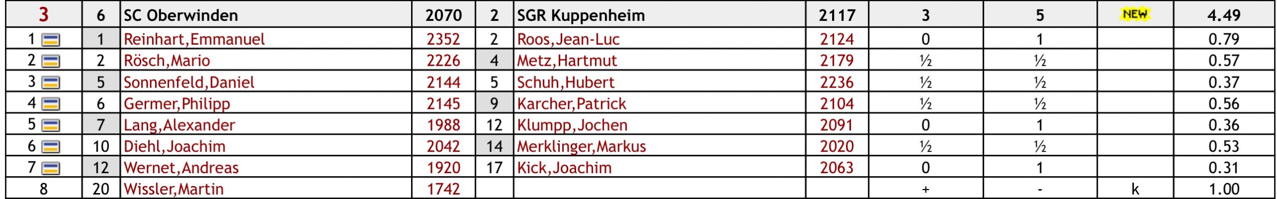 In der Verbandsliga empfing die Erste den Tabellenzweiten aus Kuppenheim. Kampflos ging man gleich mit 1:0 in Führung, da die Knöpflestädter zu Gunsten ihrer Zweiten darauf verzichteten vollständig anzutreten. Im weiteren Verlauf einigten sich Daniel Sonnenfeld, Philipp Germer und Joachim Diehl mit ihrem Gegner auf Remis. Schlecht aus der Eröffnung kam MF Alex Lang. Sein Damenisolani kam heftig unter Druck und ging verloren. Mit etwas aktiverem Spiel hätte die Partie vielleicht noch in der Remisbreite gehalten werden können, so ging der Punkt jedoch an den Gegner. Auch Andi Wernet hatte kein glückliches Handy mit der Eröffnung. Allerdings konnte er sich wieder zurückkämpfen um dann im 38. Zug leider die Zeit zu überschreiten. Mario Rösch versuchte lange seine Partie noch auf den Gewinnweg zu führen, doch der Gegner lies nichts zu, so dass die Partie Remis endete. Auch am ersten Brett hatten die Oberwindener kein Glück. Manu Reinhardt verlor einen Bauern und hatte ständig eine beengte Stellung. Durch Figurenmanöver konnte sein Gegner die Stellung verbessern und die Partie gewinnen. Es war aber nicht nur diese Mannschaftsniederlage mit 3:5, zu allem Überfluss konnte der Konkurrent im Abstiegskampf 3ländereck gegen den haushohen Favoriten Dreisamtal gewinnen. Damit wird es vor den beiden letzten Spieltagen im Abstieg noch einmal eng. Aber auch um den Oberliga-Aufstieg wird es spannend. Kuppenheim ist Tabellenführer, Gottmadingen und Dreisamtal in Lauerstellung.