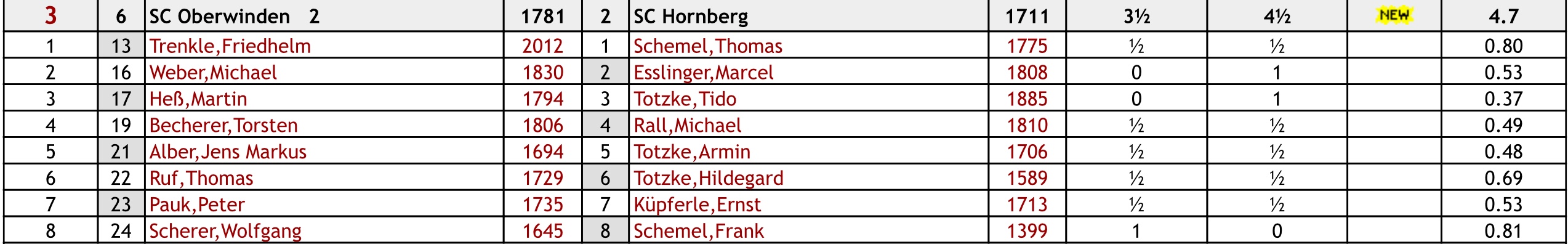 Trotz Niederlage behielt die Zweite die Tabellenführung in der Bereichsliga. Mit nun nur noch zwei Punkten Vorsprung wird es auch hier nochmal eng. Nominell etwas stärker eingeschätzt verlor die Oberwindener Reserve gegen Hornberg knapp mit 3,5 zu 4,5. Wolfgang Scherer konnte als einziger seine Partie gewinnen. Remis spielten Friedhelm Trenkle, Torsten Becherer, Jens Alber, Thomas Ruf und Peter Pauk.