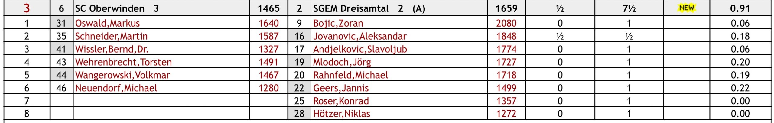Die Dritte hatte im Bezirksliga-Match gegen den Tabellenführer aus Dreisamtal nichts zu bestellen. Man konnte auch nur mit 6 Mann antreten und verlor erwartungsgemäß mit 0,5:75, Lediglich Martin Schneider konnte ein Remis verzeichnen. Damit bleibt man zwar auf dem 8. Platz, allerdings hat sich der Abstand nach hinten verkürzt. Die letzten beiden Spieltage stehen auch hier im Zeichen des Abstiegskampfes.