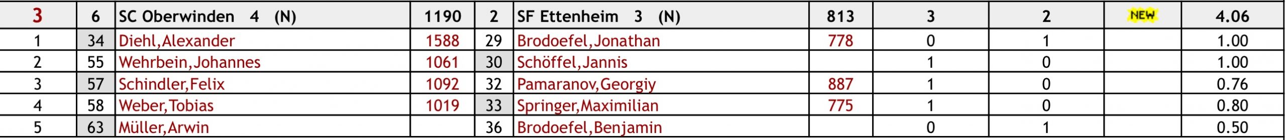 Die Vierte war der einzige Lichtblick an diesem Tag. Kurzfristig erklärte sich Alex Diehl bereit, die Vierte im Abstiegskampf zu unterstützen. Leider verlor er seine Partie, sorgte aber durch seinen Einsatz für ein vollständiges Team und die hinter ihm spielenden hatten machbare Aufgaben. Arwin Müller konnte eine gute Chance leider nicht nutzen und verlor, Johannes Wehrbein, Felix Schindler und Tobias Weber setzten sich gegen ihre Gegner durch und sicherten dem Team einen 3:2 Erfolg. Trotz dem Sieg steckt auch die Vierte mitten im Abstiegskampf.