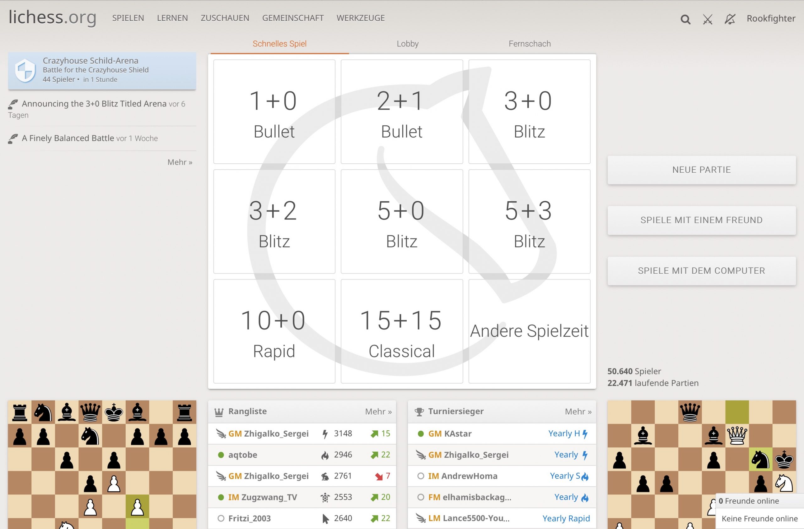 Am Dienstag, 17.03. um 20:30 spielen wir ein Blitzturnier auf Lichess. Lichess.org ist eine Schachplattform die mit dem PC über den Browser erreichbar ist. Bei Handy und Tablet gibt es eigene Apps, die auf diesen Geräten geeigneter erscheinen. Anmeldung ist absolut kostenlos und man findet jegliche Spielstärke. Damit nicht unnötig lange Pausen entstehen, gibt es nicht wirklich ein Schweizer System sondern es wird im sogenannten Arena-Modus gespielt. Wer fertig ist wird neu ausgelost und bekommt einen Gegner, der die ähnliche Punktzahl hat.