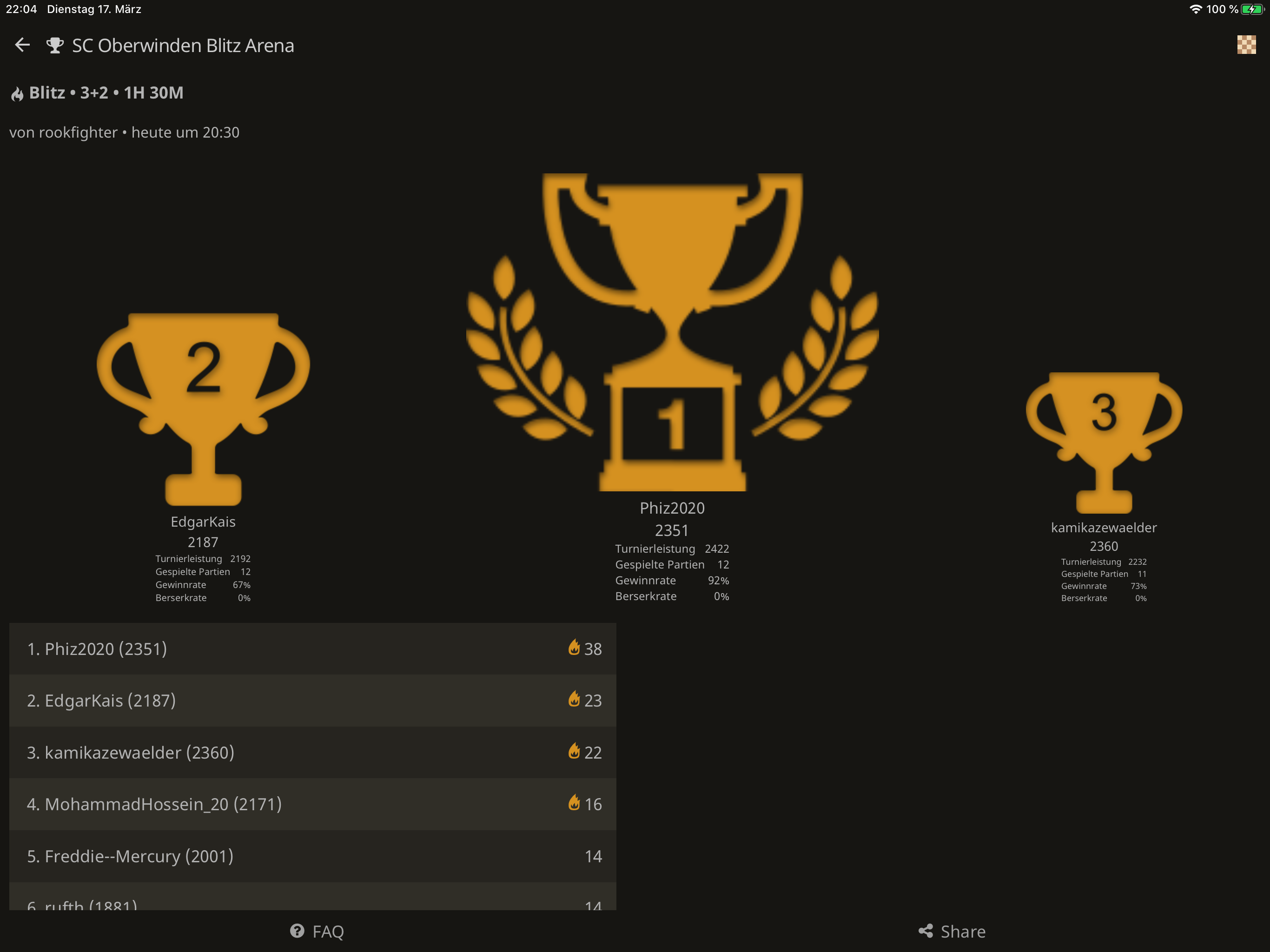 Insgesamt 25 Schachspieler fanden sich auf Lichess ein um in der SC Oberwinden Blitz Arena den virtuellen Spielabend zu gestalten. Auch wenn nicht alle Spieler bekannt waren, war es doch ein kurzweiliges Turnier.