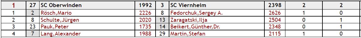 Am ersten Brett hatte Mario Rösch einen hervorragenden Tag und konnte in einem Franzosen eine als eher ungenau geltende Variante aufs Brett bringen. Als GM Fedorchuk die Eliminierung von Marios Läuferpaar auslies, nutzte Mario die Chance und verbesserte seine Stellung Zug um Zug. Einzelne Fallen die ihm gestellt wurden, konnte er umschiffen um dann in ein Endspiel erst mit einem, dann mit zwei und zuletzt mit drei Mehrbauern zu gelangen. Nachdem auch der letzte verzweifelte Versuch die Partie zu retten der ehemaligen Nr. 51 der Welt misslang, gab er auf. Mario hat damit zum ersten Mal einen 2600er GM geschlagen was in der Geschichte des Schachclub Oberwinden einmalig ist.