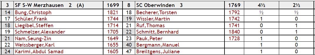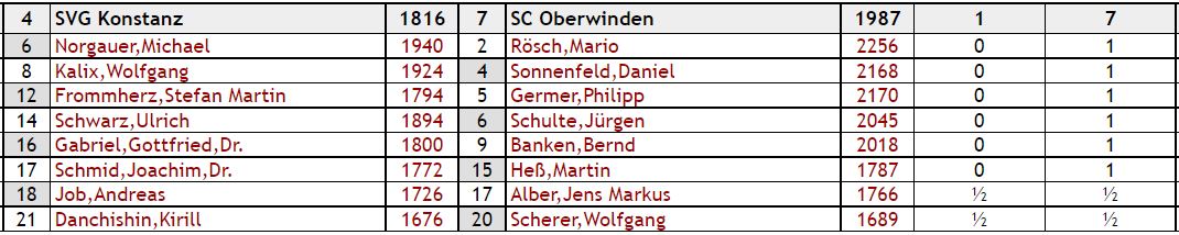 Wolfgang Scherer gab seine Partie remis und meinte in den anschließenden Gesprächen zu Partie er habe sogar durch einen ungenauen Zug die Möglichkeit auf Sieg zu spielen verpasst. Dass zeigt einerseits den vorhandenen Ehrgeiz und untermauert die positive Entwicklung aller Spieler der zweiten Mannschaft (Martin Hess, Jens Alber und Wolfgang Scherer) nehmen.