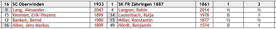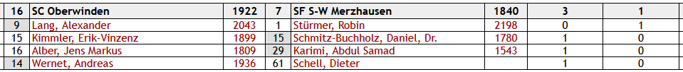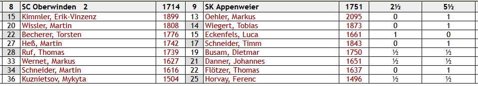 Auch die Zweite kam nicht richtig in Gang und verlor 2,5:5,5 gegen Appenweier. Recht schnell zeichnete sich ab, dass dieser Mannschaftkampf nicht an die beiden spannenden 4:4 der Vorjahre gegen Appenweier anknüpfen kann. Zu Remisen von M. Wernet, T. Ruf und M. Kuznietsov gesellten sich Niederlagen von M. Schneider, M. Heß und M. Wißler. T. Becherer gewann seine Partie. Torsten brachte mit beiden Türmen die einzige offene Linie unter Kontrolle und münzte dies in einen Erfolg um. E. Kimmler verteidigte sich bei gleichem Material sehr lange zäh, musste sich dann aber doch geschlagen geben, nachdem der Gegner seinen Raumvorteil nach und nach nutzte.