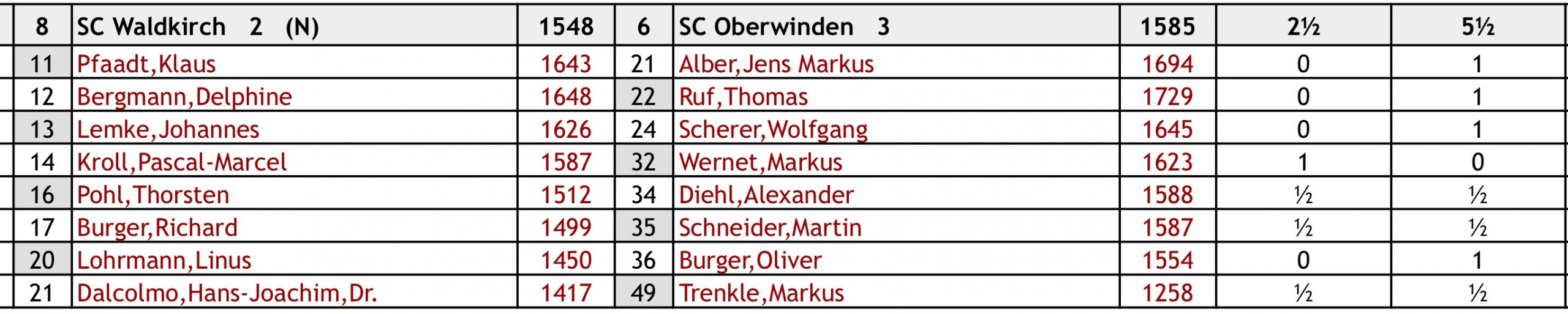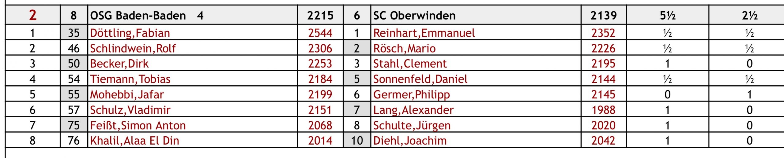 Die Erste musste bei der Vierten Mannschaft des deutschen Rekordmeisters Baden-Baden antreten. Die Kurstädter stellten die bisher beste Mannschaft in dieser Saison mit GM Döttling und IM Schlindwein an den Spitzenbrettern. Obwohl unsere Spitzenbretter Manu und Mario die beiden Titelträger problemlos egalisieren und Remis spielen konnten, waren die Kurstädter, vor allem an den hinteren Brettern, an diesem Tag besser. Lediglich Daniel Sonnenfeld konnte Remis spielen. Ein Lichtblick war die hervorragende Partie von Philipp Germer, der seine Partie auch gewinnen konnte. Letzten Endes blieb aber eine 2,5:5,5 Niederlage für Oberwindens Erste.
