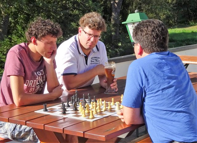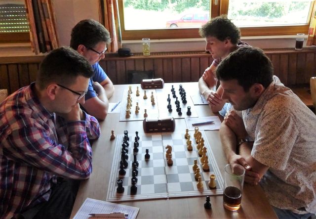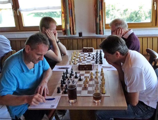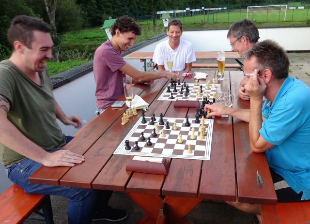 Die Freude beim Wiedersehen war natürlich groß und Heiko erkannte auch trotz dramatischer Veränderung der Haarfarbe oder des Gewichtes einzelner Oberwindener Spieler noch alle Kollegen 😉 Die sehr pünktliche Ankunft der Gäste setzte dabei die Veranstalter unter Druck. Nahezu pünktlich konnte mit der Begrüßung und dem gemeinsamen Foto begonnen werden. Das mitgebrachte Gastgeschenk in Form eines 5-Liter Rothausfässchens wurde sehr wohlwollend angenommen, hatte aber auf den Verlauf der anstehenden Partien keinen Einfluß. An allen Brettern wurde hart gekämpft, auch wenn nach der langen Sommerpause an drei Brettern letztendlich Figureneinsteller die Partie entschieden. Wie es sich gehört wurde dabei am ersten Brett zwischen Mario Rösch und Heiko Adler am längsten gespielt. Für beide war es sicher nicht einfach bei ihrem komplizi erten 4-Läuferendspiel die Konzentration aufrecht zu erhalten, da im Hintergrund massiv kommentiert, anlaysiert und Sprüche gekloppft wurde. Gerade bei letzterem konnten die Oberwindener noch einiges lernen 😉 Nebenher wurde auch noch Dart gespielt oder bei einem gekühlten Getränk fachgesimpelt. Da die Herren am ersten Brett partout nicht zu Ende kamen, wurde mit dem Essen, wozu die Meßkircher Schachfreunde eingeladen waren, schon mal ohne sie begonnen. Ein Lob an dieser Stelle an das Bewirtungsteam der Sportfreunde Winden für den leckeren Wurstsalat mit Pommes. Wahrscheinlich war es dann der Duft des leckeren Mahles und die einsetzende Stille während des Essens, die Heiko eine letzte Pattchance übersehen ließen und damit den 5:3 Endstand für Oberwinden besiegelten.