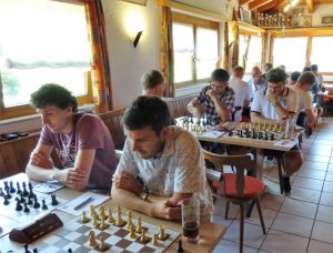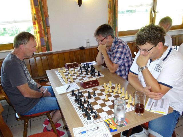 Andi Wernet spielte gegen Jannik Lorenz einen wilden Franzosen . Zunächst sah es so aus, dass der junge Kuppenheimer Andi im Königsangriff niederringen würde, doch Andi sah das ganze relativ locker, spielte auf das Läuferpaar, was ihm dann auch eine aktive Stellung brachte. Etwas unachtsam lies der Gegner Andis Turm in die Stellung eindringen, worauf er zwar noch einige Angriffsversuche abwehren musste, dies aber problemlos gelang. Einen ganz anderen Franzosen brachte Mario Rösch auf das Brett. Ohne groß etwas zuzulassen blieb sein „Franzosenläufer“ bis zum Endspiel auf c8, der seinen Platz dann nur kurz räumte um den Turm durchzulassen, um dann sofort wieder zurückzukehren. In einem ausgeglichenen Endspiel überzog Hartmut Metz die Stellung und Mario konnte zum Sieg gratuliert werden.