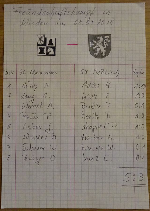 Mit 6,5 zu 1,5 gelang Oberwinden ein historischer Sieg gegen Kuppenheim. Bisher stand lediglich im Meisterschaftsjahr 2015 ein Unentschieden zu Buche. Ansonsten hatte man immer den kürzeren gezogen. Der Bericht von Kuppenheim ist hier zu finden.