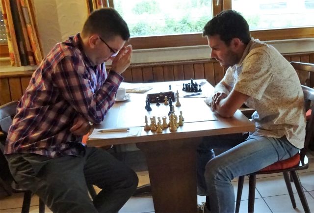 Sicher und immer stärker drückend zwang FM Manu Reinhart seinen Gegner IM Jean Luc Roos immer mehr in die Defensive. Irgendwann konnte dieser dem Druck nicht mehr standhalten und musste dem Oberwindener zum Punkt gratulieren. Über 6 Stunden musste MF Alex Lang spielen. Nachdem er einem falschen Plan folgte geriet er in eine schlechte Stellung in der er einen Bauern verlor. Zur Zeitkontrolle wickelte sein Gegner Markus Merklinger in ein Endspiel mit einem Mehrbauern ab. Alex konnte durch Damen- und Turmtausch in ein Springerendspiel mit 3 gegen 2 Bauern abwickeln. Zwar gelang es dem Kuppenheimer noch einen Freibauern zu schaffen, doch der Oberwindener umschiffte alle Hindernisse und konnte das Remis halten.