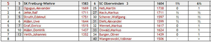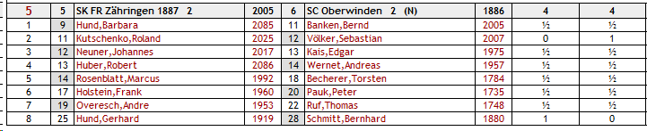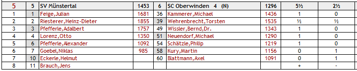 Hier auch noch vielen Dank an die zu Hause gebliebenen für die vielen aufmunternden Mails, Telefonate und Whatsapps. Zum Schluß noch der Link auf die Homepage und der Hinweis, dass die Partie Schneider, Ilja – Germer, Philipp online nachgespielt werden kann. Passend dazu der Tipp des Tages von Philipp, der auf unserem ausgedehnten Tagesspaziergang von Bad Wiessee über Holz und Golfplatz zurück erwähnte, dass in unklaren Situationen, in denen man nicht weiß was zu tun ist, einfach immer der beste Zug gespielt werden sollte 😉 Am zweiten Spieltag zeigte sich wiederum, wie hart die Saison für die Mannschaften des SC Oberwinden werden würde. Alle Mannschaften durften auswärts ran, wobei zwei Mannschaften ein Unentschieden erreichten und 2 leider ohne Punkte nach Hause fahren mußten. Oberwinden II: 2,5 : 5,5 Niederlage gegen den Tabellenführer Villingen-Schwenningen Die Oberwindener Zweite spielte in der Landesliga im wunderschönen Villingen. Dank rechtzeitiger Anreise konnte auch noch kurz die sehenswerte Innenstadt besichtigt werden. Viel mehr Sehenswertes sollte es an dem Tag auch nicht mehr geben. Thomas Ruf erwischte einen rabenschwarzen Tag und übersah eine taktische Wendung seines Gegners, wodurch wir relativ frühzeitig 0:1 zurück lagen. Leider ging es dem Mannschaftsführer Peter Pauk nicht viel besser und er erkannte in einem ausgeglichenen Endspiel eine Mattdrohung zwar noch rechtzeitig, aber in Summe zu spät, so dass der Gegner in klaren Vorteil kam und die Partie auch gewinnen konnte. Taktik entschied auch die Partien von Michael Weber und Andreas Wernet, nachdem beide die falschen Mittelspielpläne gewählt hatten. Torsten Becherer bekam dann noch vor der Zeitkontrolle ein Remisangebot des Gegners, welches er gerechtfertigter Weise auch annahm. Die beiden ungefährdeten Siege von Bernd Banken und Eddi Kais wurden noch durch den Verlust einer klar besseren Stellung durch Christian Riotte überschattet, so dass unter dem Strich ein deutliches, wenn auch aus Oberwindener Sicht zu hohes, 2,5 : 5,5 stand. Villingen-Schwenningen festigt damit seine Tabellenführung und Oberwinden ist Dank der besseren Brettpunkte gerade noch außerhalb der Abstiegsränge. Oberwinden III: 4 : 4 gegen den Neuling Freiburg West Die Dritte fuhr am zweiten Spieltag zum Bezirksklassen-Neuling Freiburg West. Nach DWZ-Schnitt der eingesetzten Spieler ein ausgeglichenes Match, auch wenn an den einzelnen Brettern eine Stärkedifferenz bis zu 100 DWZ-Punkten (Gewinnwahrscheinlichkeit des DWZ-stärkeren bei 64%) vorkamen. Letztendlich gab es auch ein verdientes Unentschieden, wobei an Brett 1 Martin Hess einen stärkeren Gegner besiegen konnte und Markus Oschwald seinen DWZ-Vorteil umsetzte. Dafür setzten sich die Gegner in den Partien von Alexander Diehl und Markus Wernet leider durch. Oberwinden IV: als Neuling in der Kreisklasse B mit 6 : 2 gegen Freiburg-Zähringen 1887 unterlegen Die Vierte Mannschaft des Schachclubs Oberwinden ist für den Gegner schwer auszurechnen, da ein großer Pool an Spielern eingesetzt wird. So wurden gegenüber dem ersten Spieltag auch gleich an 5 Brettern Veränderungen vorgenommen. Trotz leichter nomineller Überlegenheit, konnte die DWZ nicht auf’s Brett gebracht werden. So mußte der geringen Spielpraxis an der einen oder anderen Stelle Tribut gezollt werden und einzig Michael Neuendort konnte einen Sieg einfahren. Damit steht die Vierte Mannschaft am zweiten Spieltag mit Ettenheim II und Heitersheim III noch punktlos am Tabellenende. Oberwinden V: 2 : 2 gegen Endingen IV und damit das zweite Remis am zweiten Spieltag Gegen Endingen IV schaffte die Fünfte von Oberwinden ein Unentschieden. „Schaffte“ deshalb, weil der Gegner mehr DWZ ans Brett brachte. Da es sich bei beiden Mannschaften um Jugendliche handelt, deren Wertungszahlen häufig sehr starken Schwankungen ausgesetzt sind, ist dies nicht der richtige Maßstab. Ziel war es nach dem Remis der ersten Runde 2 Mannschaftspunkte zu erspielen, was nicht gelang. Damit sind die Aufstiegsränge zwar noch erreichbar, aber es gilt mit Ruhe und Konzentration in die nächsten Runden zu gehen, um den ersten Mannschaftssieg zu schaffen. Dafür ist das nun kommende Heimspiel wie geschaffen. Die Ergebnisse im Detail: Es lief schon nicht bei der Anreise. Manu’s Auto hat auf der Autobahn Feuer gefangen und ist komplett abgebrannt. Man muss von Glück sagen, dass niemand verletzt wurde. Nachdem wir den ersten Schreck verdaut hatten, setzten wir die Fahrt fort, mussten aber Manu „zurück lassen“. Die Ladenburger traten mit ihren Top-8 an, was ein nahezu ausgeglichenes Match versprochen hätte. Da wir nur zu siebt antreten konnten, was uns natürlich gleich einen 0:1 Rückstand bescherte, war es leider nicht mehr so ausgeglichen. Nach 1,5 Stunden erzielte Daniel mit Schwarz ein Remis. Nach knapp 3 Stunden musste Alex seine Partie aufgeben. In der Eröffnung hatte er Vorteil, konnte diesen aber nicht umsetzen, stellte einen Bauer und in der Folge die Partie ein. Kurz darauf musste auch Jürgen seine Partie aufgeben. Laut eigener Aussage hatte er zuvor eine vielversprechende Stellung. Sylvain spielte sicher und führte seine Partie ins Remis. Danach konnte Borya an Brett 1 seine Partie gewinnen nachdem er zuvor die Qualität gegeben und ein Remisangebot abgelehnt hat. Philipp, der sich lange im „Buch“ befand, hatte ebenfalls eine sehr gute Stellung, die er leider nicht zu etwas zählbaren umsetzen konnte. Der Schlusspunkt blieb Mario, der konzentriert spielte, Zeitnot überstand und den ganzen Punkt einfahren konnte. Endstand 3:5 für Ladenburg. Damit mussten wir gleich gegen einen unserer Konkurrenten um den Klassenerhalt die Punkte lassen. Man sagt ja, dass sich Glück und Pech innerhalb einer Saison ausgleichen. Da wir einige Chancen liegen lassen haben, macht das wiederum Hoffnung auf die weiteren Runden. Am 2. Spieltag am 20. November empfangen wir in Winden den Brombach-Achter. Alle Ergebnisse sind wie i