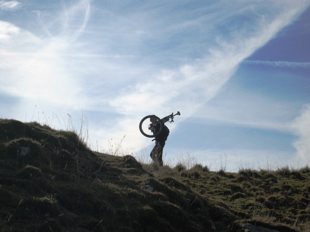 Vor den Erfolg haben die Götter den Schweiß gesetzt, nicht nur ein uralter lateinischer Spruch, sondern für uns auch erlebbare Realität vor der fünften Runde. Gestärkt mit einem sehr ordentlichen Frühstück zog es uns auf den Fockenstein. Laut Basti ein angenehmer, wenn auch etwas längerer Spaziergang. Gut, die Definition Spaziergang hatten wir nicht klar gezogen und so hat es bis auf Basti alle etwas überrascht, dass es gut 2,5 Stunden stramm bergauf ging und Teile unserer Seilschaft die letzten Meter sogar auf allen Vieren überwinden mußten. Der Blick war allerdings fantastisch und die naßgeschwitzten Klamotten schnell vergessen. Erwähnt sei hier noch ein Fahrrad“träger“, der kurz unterhalb des Gipfels sein Fahrrad schulterte und die wunderschöne Landschaft auf aus meiner Sicht recht ungewöhnliche Weise genoß (siehe Beweißfoto).